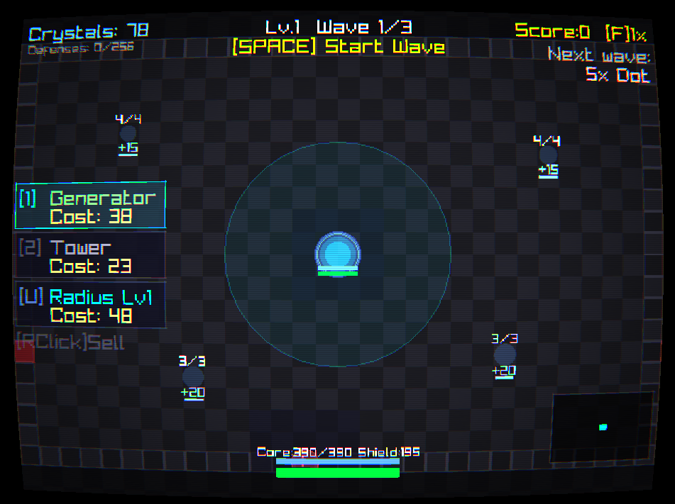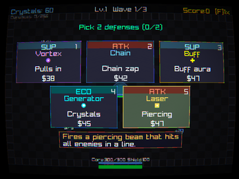 Defend your core against waves of geometric enemies by choosing towers from random card offerings. No two runs are the same — adapt your strategy to what you're dealt.